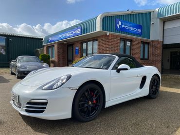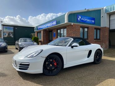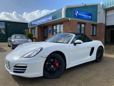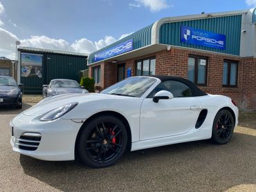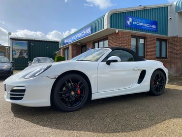 Porsche Boxster 981 supplied new in May 2014 in Pure White with black leather & alcantara interior & black canvas roof, with only 3 previous keepers on the V5. This 981 has a good specification with the highly desirable 2.7 engine, 7 speed PDK gearbox, 19 inch Boxster S alloy wheels in black, leather & alcantara interior, heated seats, rear parking sensors, telephone communication management, 2 keys & full service history.